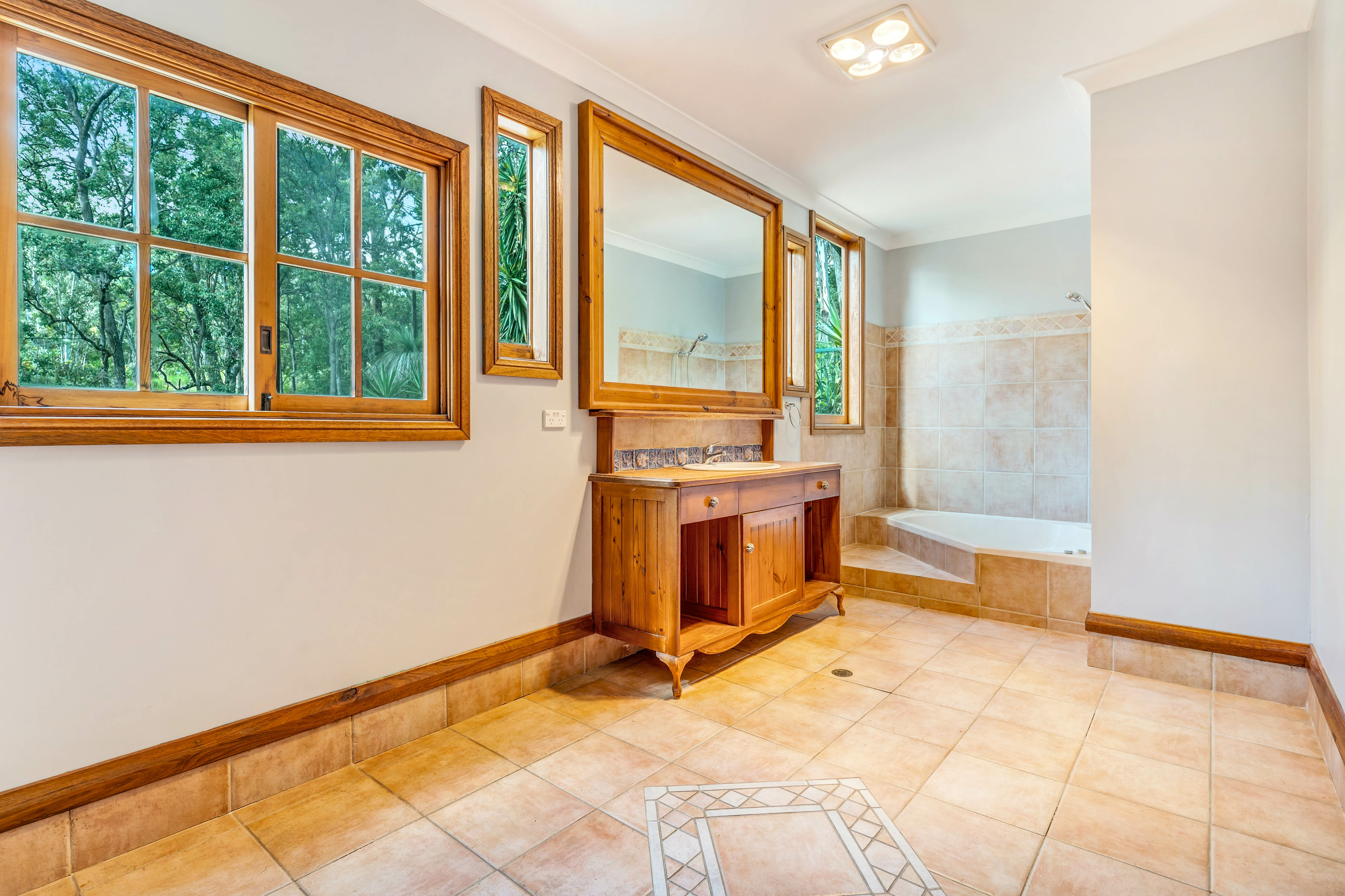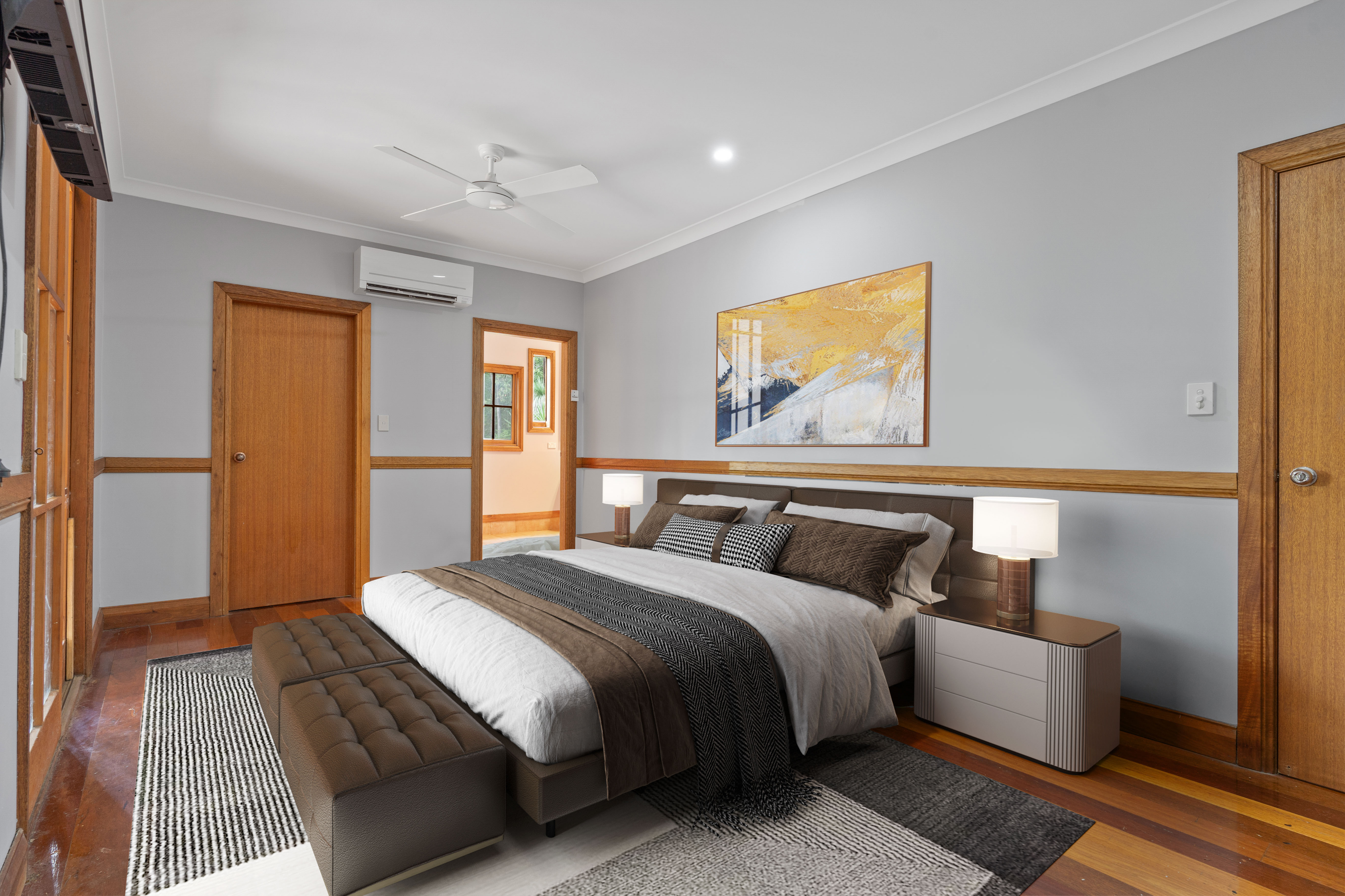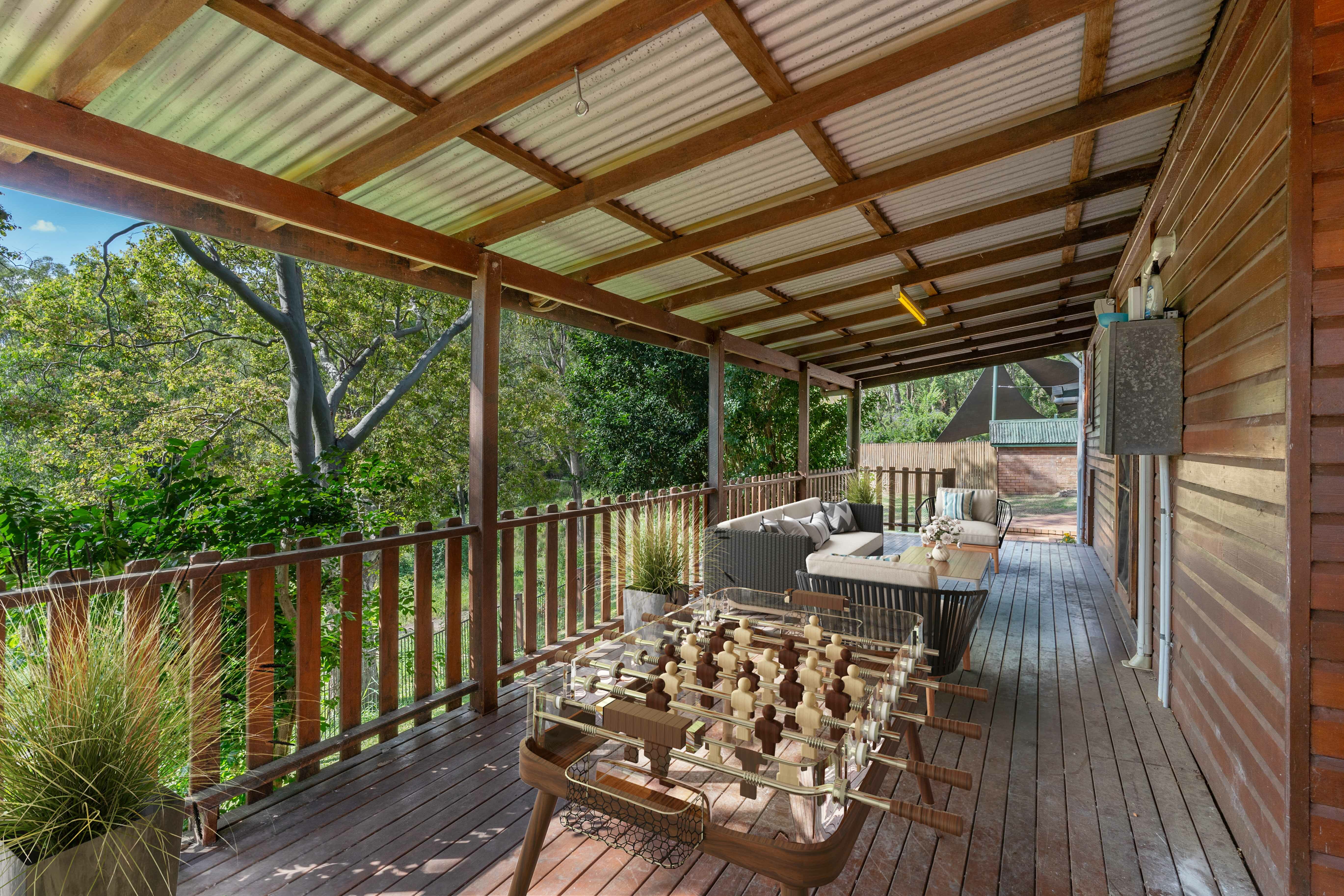 Sleeping accommodations include four well-proportioned bedrooms, two with built-in wardrobes, while the expansive master suite indulges with a walk-in wardrobe, an en-suite featuring a spa bath, and access to a secluded deck area. Air conditioning units ensure comfort throughout the seasons.