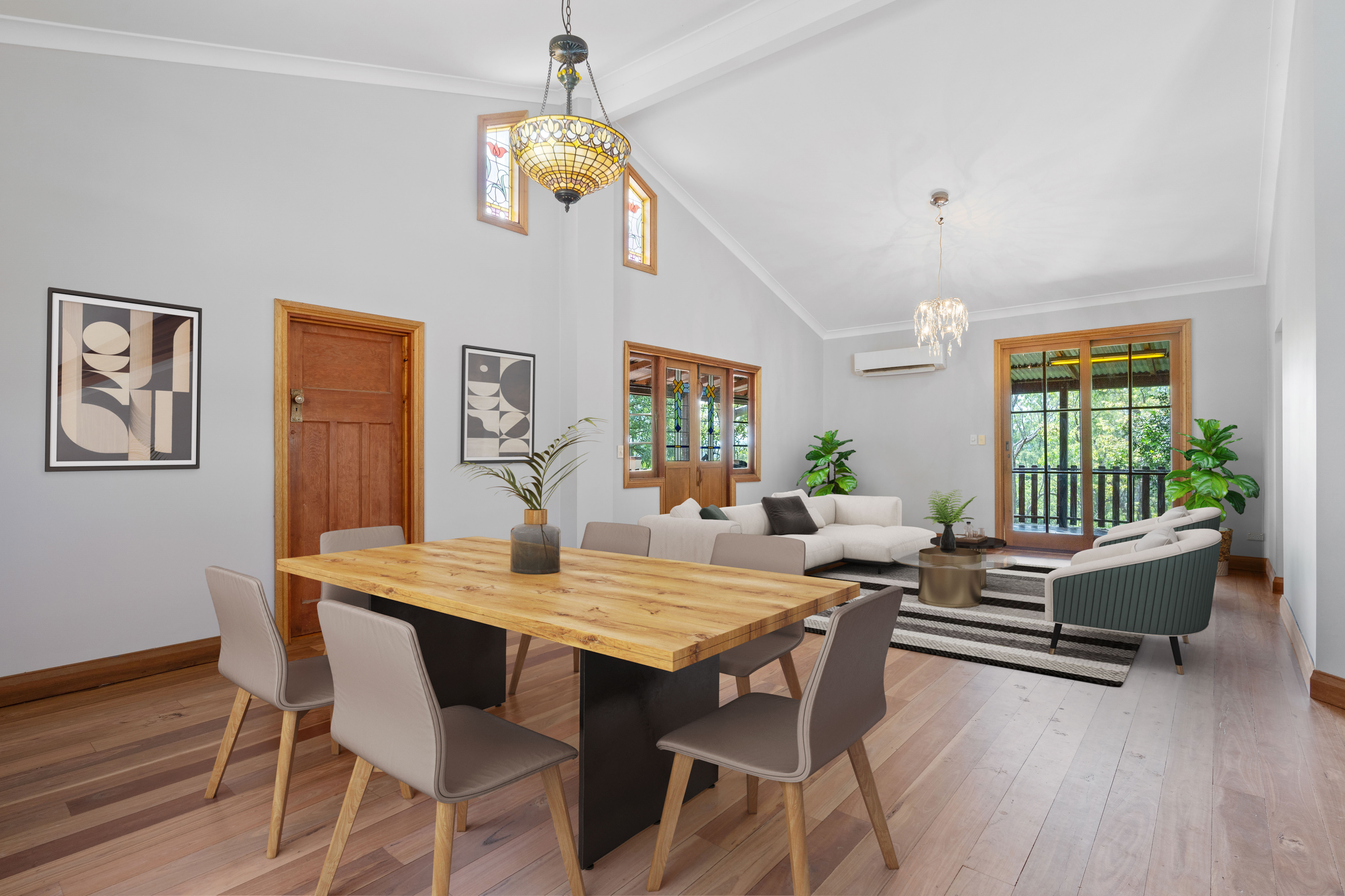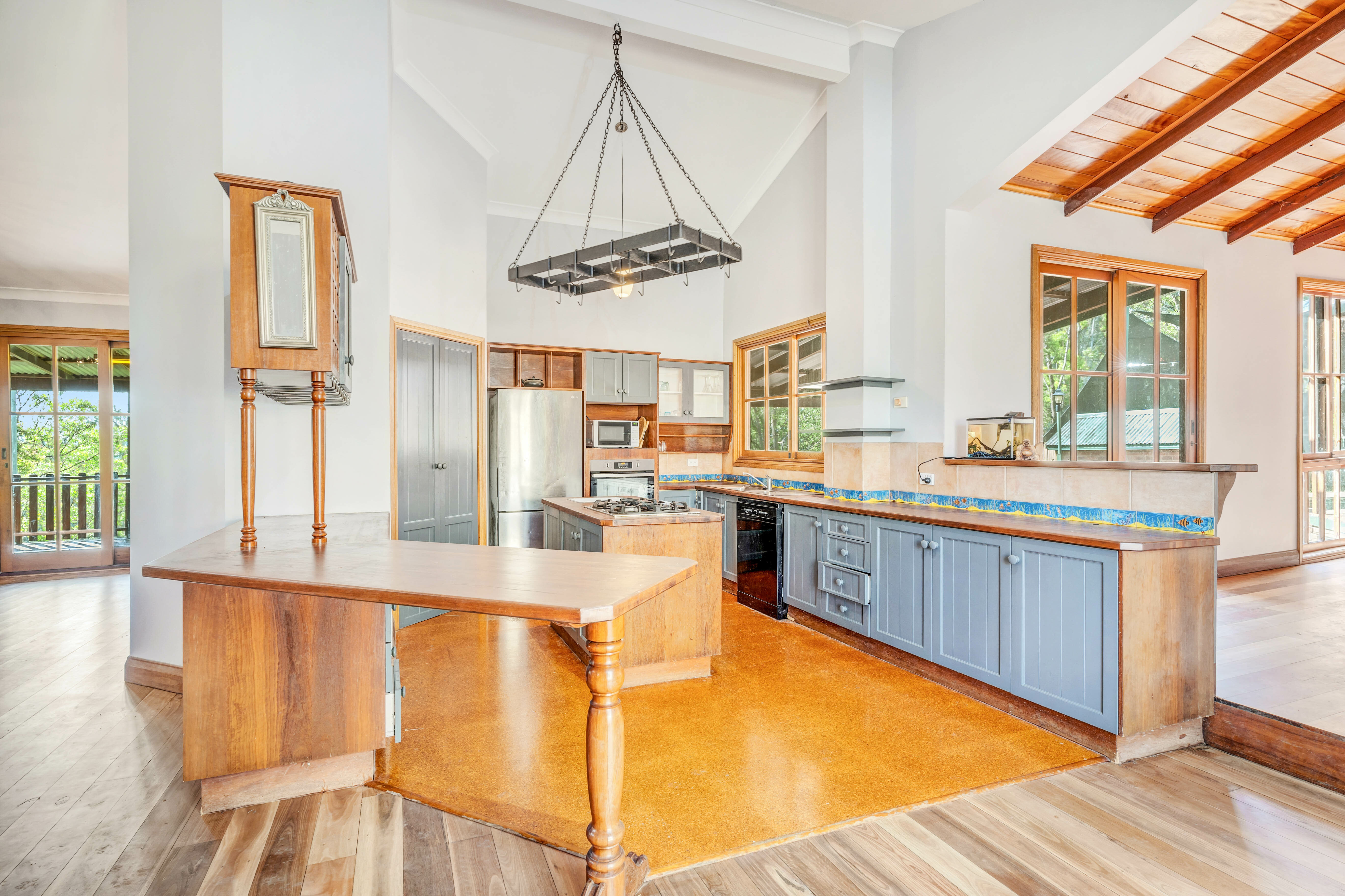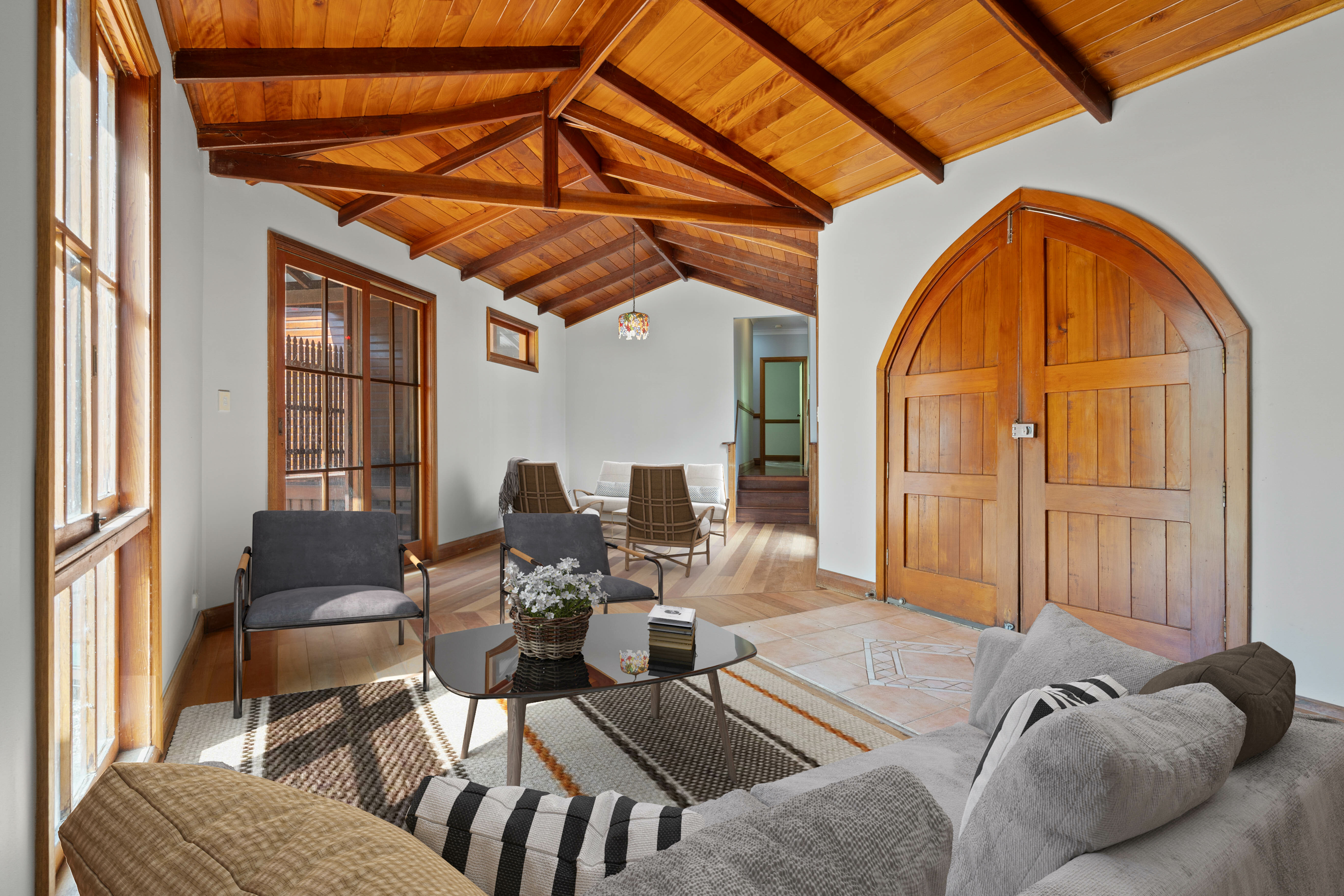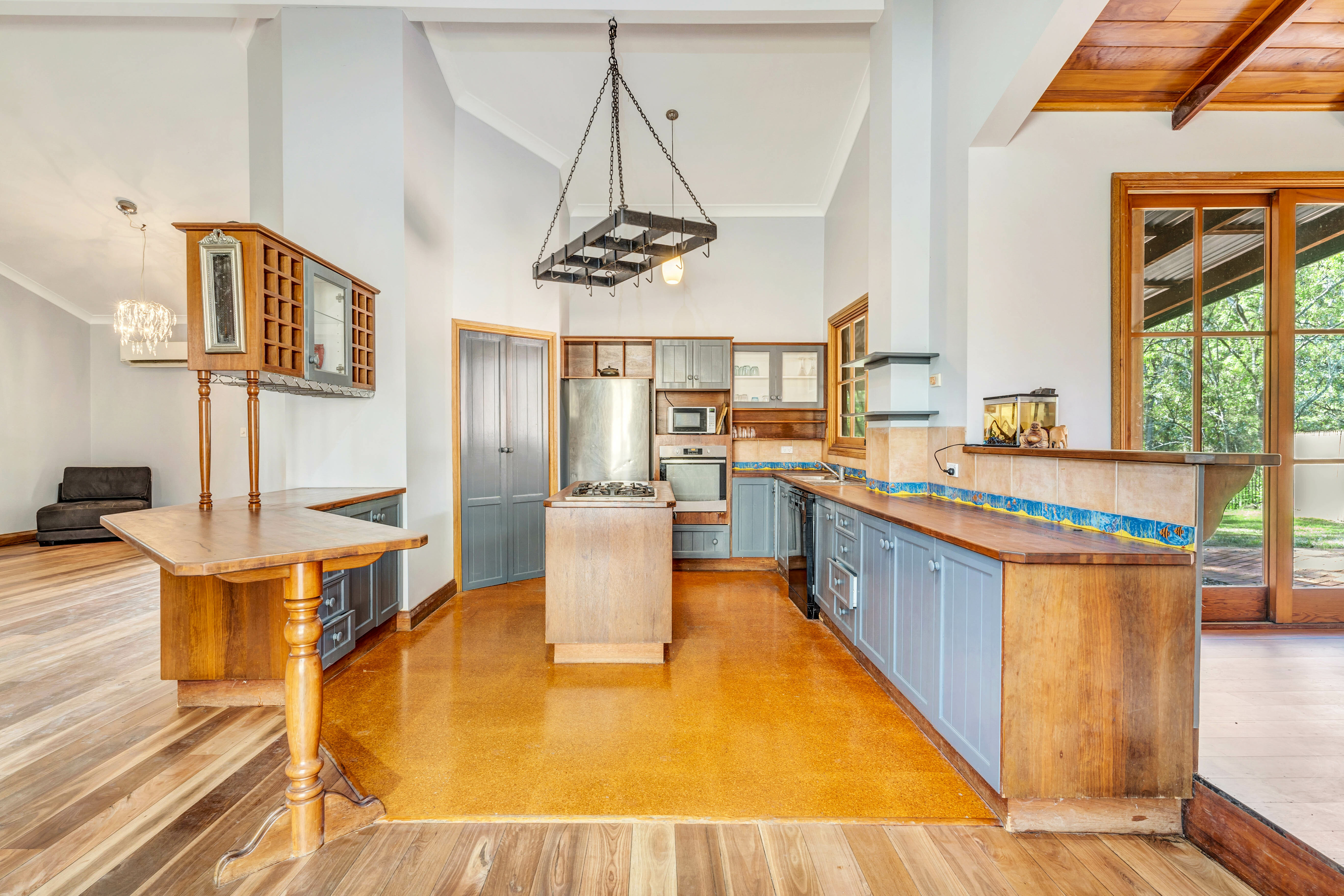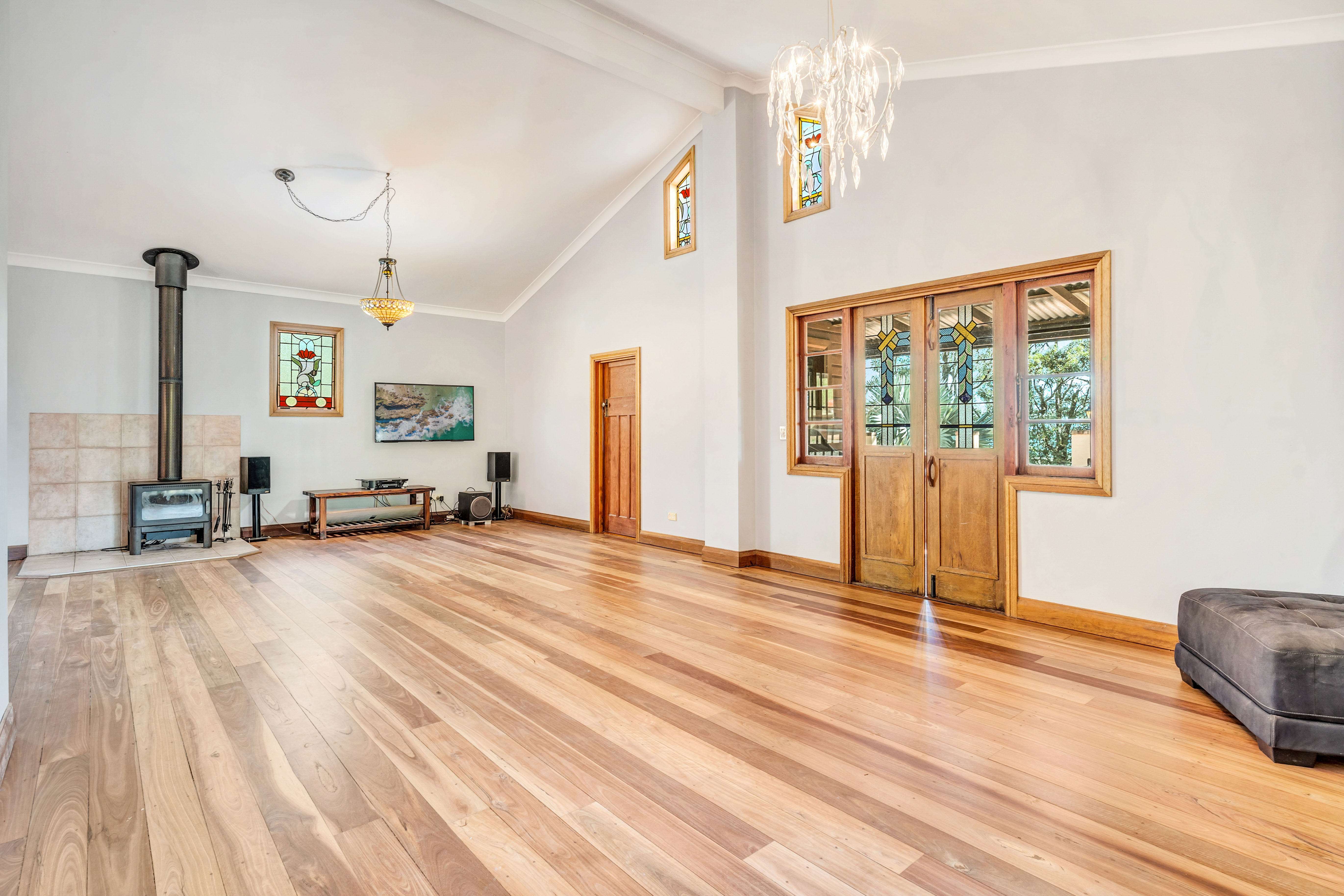 As you approach the grand cathedral-like entry doors, you're welcomed into a spacious foyer that sets the stage for the home's cathedral ceilings and rich timber finishes. The generously proportioned living and dining area, complete with a cosy wood-burning fireplace and exquisite stained-glass windows, forms the vibrant heart of this home, leading to a delightful covered verandah and an Italian-style terrace perfect for alfresco soirees.