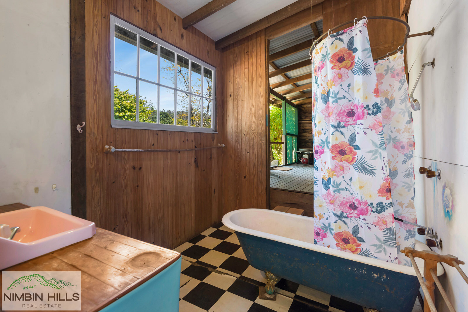 The BATHROOM is accessed via the entrance porch and has the shower over a claw foot bath and a flush toilet.