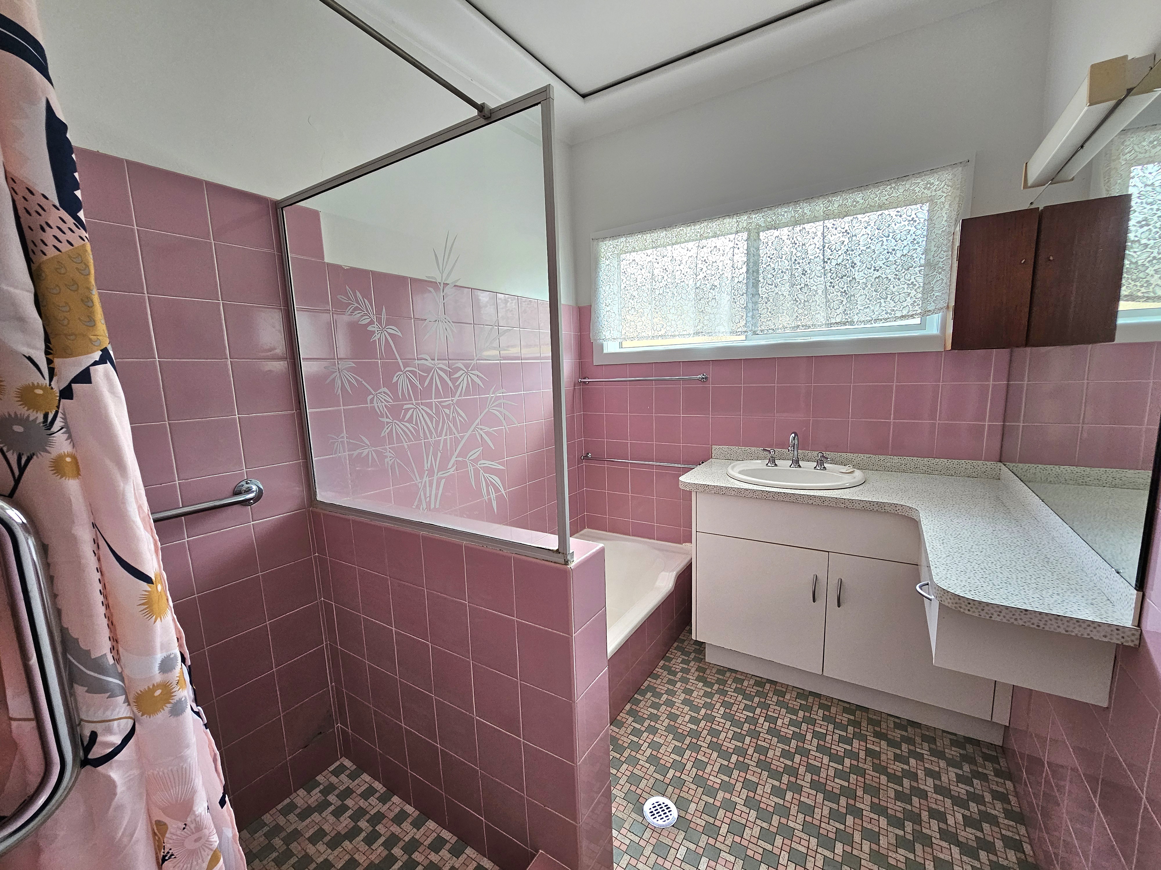 Featuring three well-proportioned bedrooms, the master bedroom benefits from built-in cupboards, offering ample storage. Additionally, a versatile sunroom adjacent to the dining area can serve as a home office or a quaint fourth bedroom. The retro bathroom retains its original charm, with a separate shower and bath, perfect for a relaxing soak.